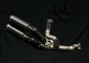 The R&D team at Vandemon believed that the project required a stealthy appearance to complement the stealthy nature of this exhaust system, so to the untrained eye, the motorcycle appears to be using the original exhaust system and catalytic converter, when in reality, where the catalytic converter once was is now replaced by a lightweight titanium Stealth twin chamber muffler which when the power button is pressed a titanium exhaust valve opens and redirects the exhaust via both unsilenced mufflers bypassing the stealth muffler and when the valve is closed the exhaust gas then redirects through the Stealth muffler after which the exhaust then will exit via the lower rear muffler for a quieter exhaust tone.