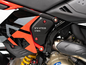 Kit of screws made from solid aluminum alloy (Ergal 7075) through high-precision CNC machining. The screws undergo a colored anodized surface treatment that enhances corrosion and wear resistance, while also providing a sleek and customized look. This kit offers a combination of lightness, durability, and style for your motorcycle, ensuring high performance and a distinctive appearance.