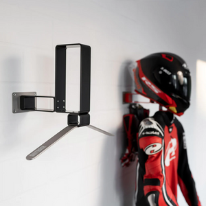 100% aluminum, the body satin powder coated, wall plate and bracket brushed and anodized. The minimalist design of the SUITBASE® PRO favors quick drying and facilitates the cleaning of the combi and helmet. Optional extensions allow our mount to be optimally adapted to your needs. By means of precisely defined radii, your equipment is stored gently. Pressure points on the helmet padding or protectors are avoided. Our mount easily holds 25 kg and is suitable for combis with airbag systems.