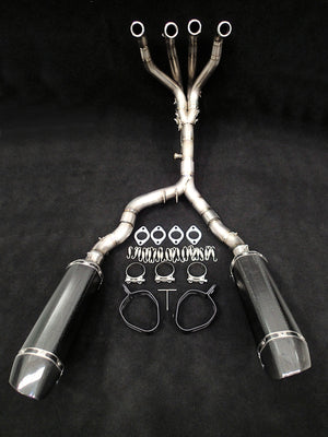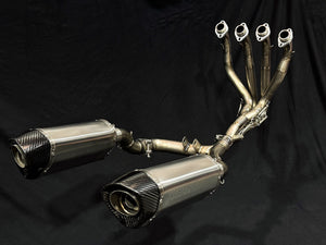 The Kawasaki Z1000 4-into-2 exhaust is constructed from high-quality Japanese Ti1 titanium and is available with two carbon fiber or titanium mufflers. As a result, the entire exhaust system is significantly lighter than the OEM stainless steel exhaust system. This weight reduction noticeably improves handling, enhances acceleration, and reduces stopping distances.
